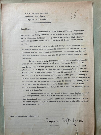 La grana, o la granata, scoppia il 10 del mese, quando l’ufficio di Bocchini è tempestato di lettere. La prima è dello stesso monsignore, che l’8 settembre ha ricevuto dalla Regia Questura l’ordine di lasciare l’Italia entro cinque giorni. Scrive in terza persona: “Dato che egli non si sia mai occupato di politica ed ha sempre tenuto un atteggiamento corretto ed amorevole verso l’Italia che da tanti anni benevolmente lo ospita, non ha potuto non rimanere addolorato per il provvedimento preso al suo riguardo”. Poi fa presente di avere ricoverata a Roma la mamma ottantaquattrenne, senza altri parenti che lui, da nove mesi a letto per la rottura di un femore e sofferente di cuore: “Lo scrivente non esagera quando afferma che il suo allontanamento sarebbe per la madre un colpo tale da causare la morte”. Croft-Fraser “supplica” pertanto “di voler benignamente sospendere il provvedimento preso a suo riguardo; salverà così da sicura morte una povera vecchia, madre di unico figlio il quale resterà eternamente grato alla medesima Eccellenza Vostra”.
