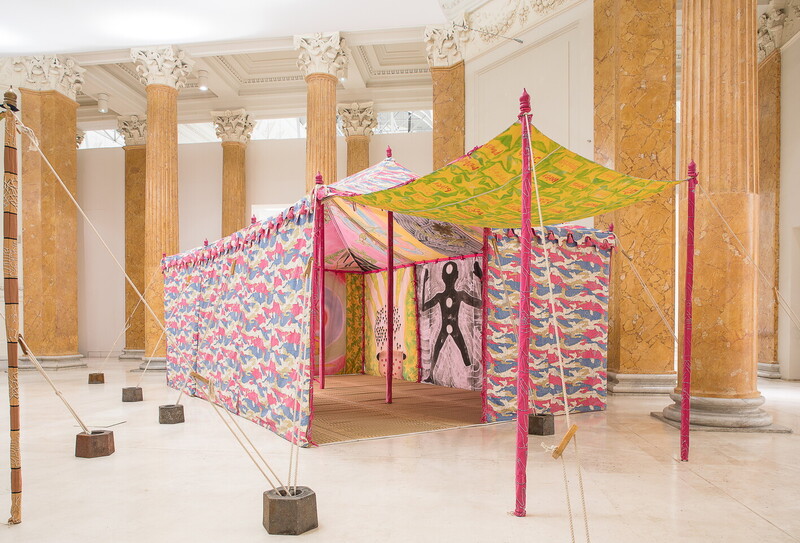 La tenda in mostra più sorprendente, in questo senso, è proprio la Tenda Museo, dove il suo Io camaleontico sfida la concezione dell’autoritratto rivelando molteplici visioni di sé e dove, per dirla con il suo amico Salman Rushdie, Clemente è “una metamorfosi per eccellenza – attore, clown, maschera, avatar – e, scivoloso come il leggendario Vecchio del Mare, si contorce come un’ombra”. Tra le pareti/tele di questa tenda l’artista fronteggia l’agghiacciante simmetria di una tigre, cattura un pesce fuori dalla cornice, si sporge lui stesso fuori dalle cornici/specchio diventando altro da sé.