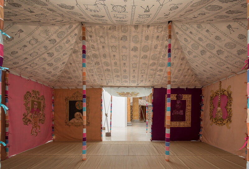“Da lui ci si aspettano i grandi quadri che l’hanno reso famoso nel corso del tempo, invece qui abbiamo uno dei punti più alti della sua carriera”, mi confessa con orgoglio il curatore Pietromarchi, “dove all’interno delle tende tocca tutti i suoi temi in totale libertà. Nuovo e libero”. La pittura di Clemente, dunque, passa dalla tela incorniciata a quella tesa da tiranti, pesi e pali, trasformandosi in luogo d’incontro insieme vulnerabile e resistente, una realtà morbida e solida. Non una visione solitaria di fronte a un’immagine, ma l’esperienza di essere all’interno dell’opera, camminando tra le opere. Il paesaggio estetico di “Anima nomade” è ricchissimo di riferimenti metafisici, spirituali e mistici, in modo da intrecciare figure umane, animali e divine con un approccio lirico ed emotivo, unicamente espresso dal suo senso del colore.