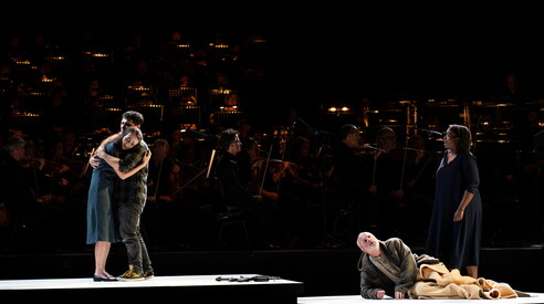 Tutte queste suggestioni arrivano condensate in due partiture del XXI secolo musicalmente agli opposti ma ugualmente preziose. La scrittura basata su microelementi di Saariaho propone timbri sospesi, armonie iridescenti e silenzi carichi di tensione che trasformano l’orchestra in personaggio e il coro amplificato in un’eco dell’antico coro greco. La regia di Peter Sellars è minimale, quasi una forma concerto che vede l’orchestra sul palco e i protagonisti muoversi su due pedane sospese sulla buca dell’orchestra. Sullo sfondo una serie di luci neon che cambiano colore accentuando situazioni e stati d’animo.