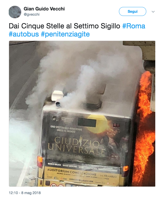 Si può e si deve parlare del doppio flambus odierno (espressione romano-francesizzante ormai invalsa per i frequentissimi casi di autobus che vanno a fuoco). Uno dei due episodi come saprete è avvenuto in pienissimo centro politico-amministrativo, a due passi da palazzo Chigi, ma ancora più vicino al Nazareno sede del Pd, vicinissimo alla nuova Rinascente e alla Fontana di Trevi, frequentatissime da turisti. Fiamme e poi l'esplosione, con annesso eroismo di un carabiniere in congedo, che interveniva per calmare i viaggiatori e favoriva un ordinato deflusso dal mezzo, convincendo i recalcitranti e consentendo la piena incolumità degli evacuati. Purtroppo è rimasta invece leggermente ustionata una giovane donna che lavorava in un negozio vicino al punto dell'incendio. Appreso della mancanza di gravi danni alle persone su internet è partita una corsa non tanto all'invettiva ma a una altrettanto spietata presa in giro dell'inefficienza della giunta romana, quella che aveva da poco festeggiato il trionfo del mantenimento del controllo dell'Atac e della sua imminente rinascita. Ecco qui alcune delle battute migliori.