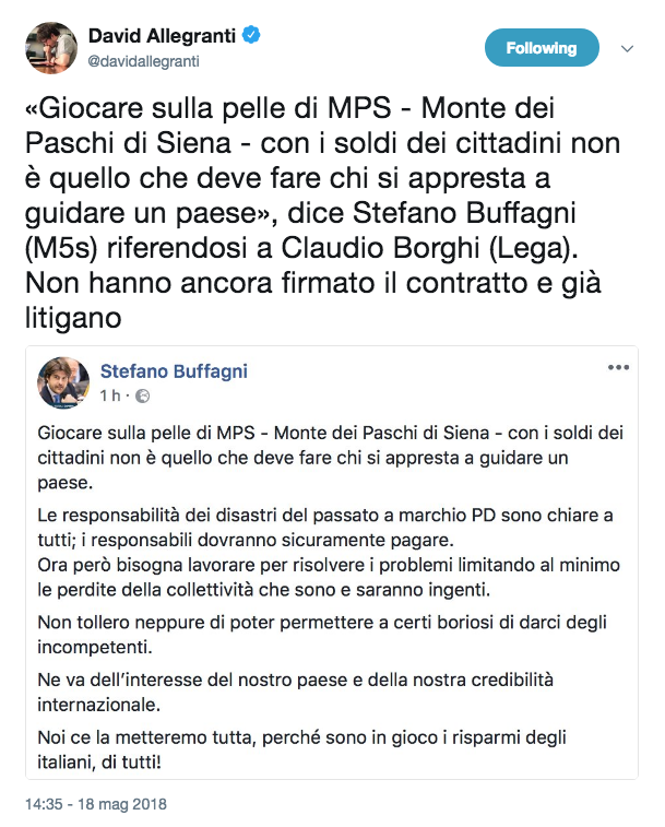 Scusate la fissazione ma siamo ancora sulla gabbianomics ed ecco l'altra ideona di Borghi. Come si pagano i debiti? Ma con altri debiti ovviamente. E quindi ecco i minibot per contestare i creditori dello stato. Il Ft ci vede un pericolo letale per l'Europa, in Italia ancora nessuna protesta forte.