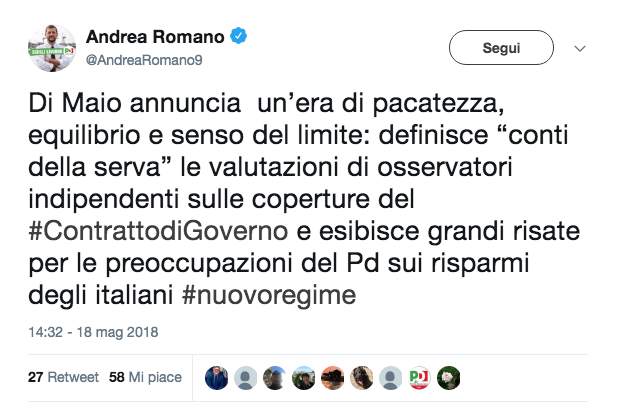 Ma cosa votano? Un programma irrealizzabile, cui la Lega si sta vincolando e così butta via una sua pur radicata tradizione politica, e votano senza il nome del presidente del Consiglio. Ma che roba è? Comunque per cena qualcuno avrà letto tutto l'elaborato e potrà riferire agli altri. Mentre Luigi Di Maio sbruffoneggia con Bruxelles.