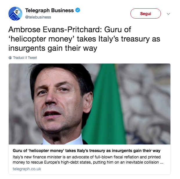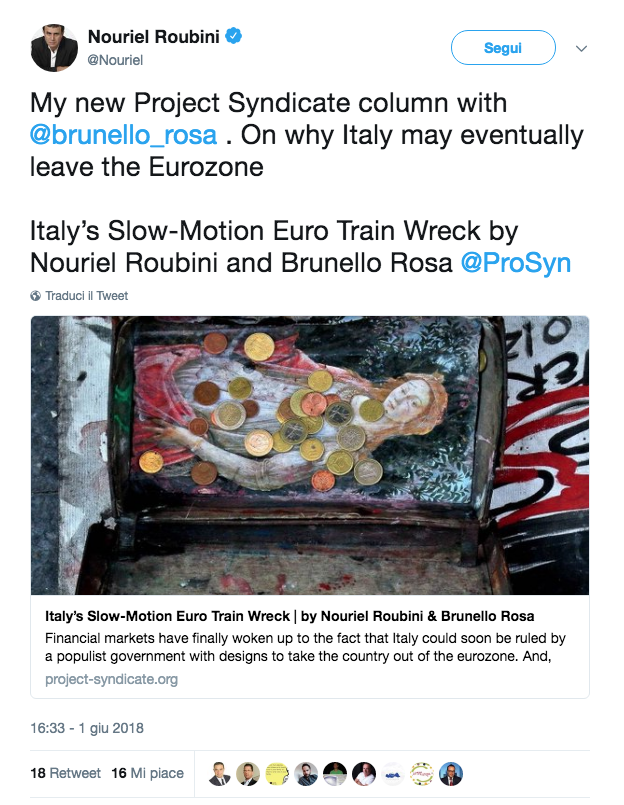I mercati, sempre siano lodati, se ne stanno tranquilli a crescere con gli indici in rialzo e lo spread in calo. Tutto apparentemente tranquillo, ma ovviamente al primo accenno vero, non stoppato da Tria, di brusco aumento del deficit con misure strutturalmente costose, come la eliminazione della legge Fornero, tornerebbero a mordere. Mentre un giornale conservatore inglese non prende con simpatia l'avvio del nuovo governo italiano, e taccia Conte di essere il Guru della Helicopter money. Mentre Nouriel Roubini e Brunello Rosa guardano alle tentazioni di uscita dall'euro e ai fattori che potrebbero spingere verso quella scelta drammatica.