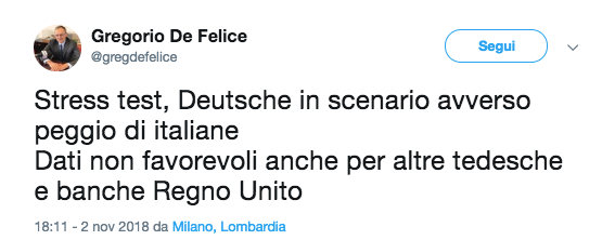 Gli stress test delle banche sono andati benino, ma i problemi, si sa, sono in quelle piccole e medie, non ancora messe alla prova. Comunque un po' di calma è positiva, sempre però considerando che a essere presi in considerazione sono i bilanci 2017, ma la prova da spread anche tostissimo è abbastanza superata (sempre parlando delle maggiori banche). Sono più stressate le banche tedesche (come si attendeva).