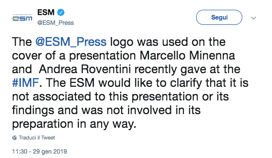 Il candidato a guidare la Consob e perciò a vigilare sulle società e sui mercati finanziari sbugiardato pubblicamente da una grande istituzione finanziaria europea, lo Esm (European stability mechanism), ovvero il grande fondo, partecipato da tutti e dotato di risorse da usare per contrastare crisi sistemiche. È successo che Marcello Minenna abbia annesso il logo Esm a una sua analisi/presentazione e sia stato poi pubblicamente smentito. Un episodio che dovrebbe tagliare ogni possibilità di ricevere la nomina alla Consob. L'imbarazzante figuraccia è condivisa con un altro esponente del grillismo economico, Andrea Roventini. Va poi osservato che entrambi rivolgevano la loro presentazione al Fondo monetario internazionale, esponendo così l'intera comunità accademica italiana.