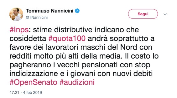 Al senato, nel sovrano disinteresse sovranista, oggi era giornata di audizioni sui provvedimenti del decreto con il nuovo welfare, quindi pensioni e sussidi. Tutti i convenuti hanno usato accenti critici, riportati però dalla sola opposizione.