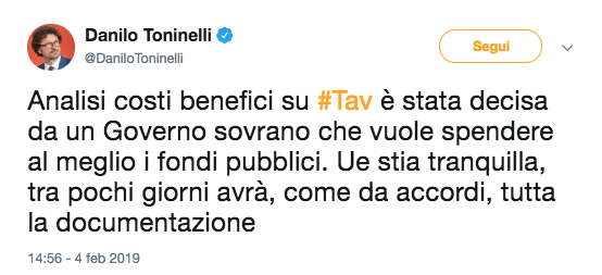 L'Unione europea dice una cosa logica (e perfettamente coerente con le regole comunitarie): se l'Italia intende uscire dal progetto del corridoio europeo dei trasporti che comprende la tratta Torino-Lione potrebbe arrivare una richiesta di risarcimento e i fondi stanziati potrebbero essere destinati ad altri progetti europei. La commissione ricorda anche che questa nuova analisi costi benefici non la riguarda, in quanto ne era stata già prodotta una nel 2015. Semplici e solidi argomenti. Ma Toninelli la prende sul personale e sfodera uno spirito battagliero un po' fuori luogo, rispondendo che la sua analisi costi benefici arriva nientemeno che dalla decisione di uno stato sovrano e quindi non si impicciassero questi altri. Gli si potrebbe far notare che un tunnel che parte in un paese e finisce in un altro difficilmente è questione sovrana (se non altro per incontrarsi a metà scavo è bene lavorare d'intesa e non sovranamente). Poi passa alla maleducazione classica, con un bel chissenefrega di andare a Lione (come se l'obiettivo fosse la placida città che ha visto i successi del compianto Bocuse).
