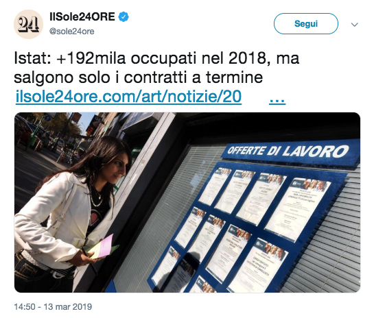 Poi c'è l'andamento dell'economia. Oggi qualche dato sul lavoro si è prestato a letture interessanti e ad alcune piccole manipolazionii, perché, riguardando i risultati del mercato del lavoro l'intero 2018, si può facilmente vedere gli effetti del governo del cambiamento. E' sufficiente, infatti, concentrarsi sul quarto trimestre del 2018 e, sia pure senza un pieno valore come indicazione statistica, si avrà la rappresentazione di un cambio improvviso delle condizioni del mercato del lavoro.