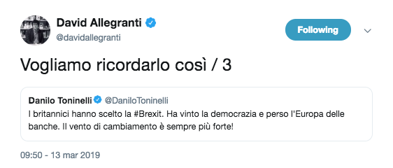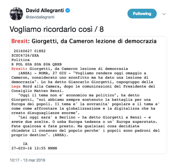 L'onda anti-politica, del cambiamento tanto per cambiare, del popolo sovrano di sé stesso e quindi di niente, è partita da lì, dalla Brexit, lo sappiamo e questo divincolarsi e boccheggiare non sapendo che farsene ora dei propositi di uscita dallUE o meglio non sapendo come realizzarli, sono la migliora cronaca, comodamente in diretta, dei recenti fatti politici. David Allegranti oggi si è divertito a ripescare da Twitter le frasi celebranti pro-Brexit dei populisti italiani, l'effetto, una dopo l'altra, è inebriante. "Vogliamo ricordarlo così" è l'intenzione ironica dichiarata che precede ciascun vecchio tweet da brexiteer di complemento, andate e leggeteli e vi divertirete molto oltre a predisporvi un armamentario di argomenti puntuti per cena.