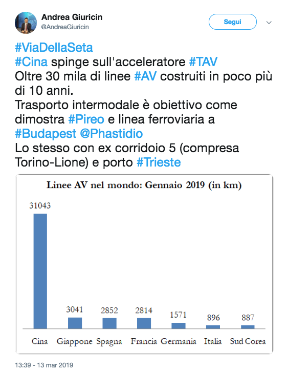 Fioccano le perplessità sullo zelo filo-cinese del governo, In generale, se vi dovesse capitare diparlarne, tenete ben presente una differenza fondamentale. Allora, è chiaro che tutti vogliono fare affare nel ricco mercato cinese e promuovere maggiore interscambio, attirare compratori e inviare lì proprie merci, e attirare anche capitali, investitori. Questo è legittimo e, anche se l'Europa dovrebbe, con una voce unica e comunitaria, coordinare e anche proprio dirigere le politiche commerciali extra-Ue, si può accettare che i singoli stati facciano, nel quadro definito dell'Europa, specifiche politiche di promozione dei loro produttori. Ciò che si appresta a fare l'Italia è diverso. E' l'attribuzione del controllo su infrastrutture e logistica nazionali, scelta che, inevitabilmente, pone in un ruolo subalterno. Curioso, ma è stato già detto, che promani da dichiarati sovranisti. e, ancora più curioso, che sia sostenuta, quella scelta, dai nemici dell'infrastrutturazione, dagli estremisti del dubbio ferroviario. Con il consueto sprezzo della vuotezza il Corriere della Sera sul tema ha intervistato il prof. avv., mentre tanti altri esponenti politici prendevano posizione sul tema.