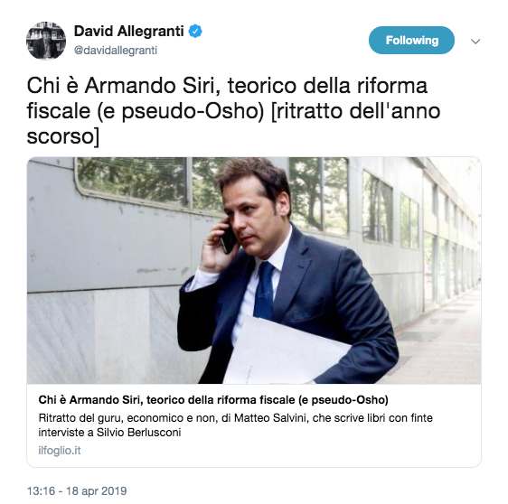 Poi c'è la vicenda del sottosegretario Armando Siri, folgoratore di Salvini sulla via della flat tax e da oggi indagato per corruzione in riferimento a una presunta tangente per inserire un emendamento a favore dell'energia eolica in Sicilia. Dopo gli attacchi di Di Maio ("si dimetta, sarebbe meglio") e quelli di Di Battista con argomenti alla dibba che potete immaginare, Salvini si difende in calcio d'angolo, chiedendo retoricamente ai 5 stelle se "Raggi da indagata si fosse dimessa". Intanto il lesto ministro Toninelli gli ritira le deleghe da sottosegretario ai trasporti. Non è incoraggiante che nel passato di Siri ci sia un patteggiamento con condanna a un anno e sette mesi per bancarotta fraudolenta.