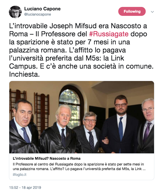 Poi c'è la vicenda del professore con connessioni in Russia e in parte dell'amministrazione Trump ricercato a Roma per mesi e ora, a quanto risulta al Foglio, fuggito dopo essere stato ospitato a lungo in una casa riconducibile alla Link University, fucina di talenti per il governo gialloverde e ateneo di riferimento per il tardivo fondatore del movimento 4 stelle Luigi Di Maio.