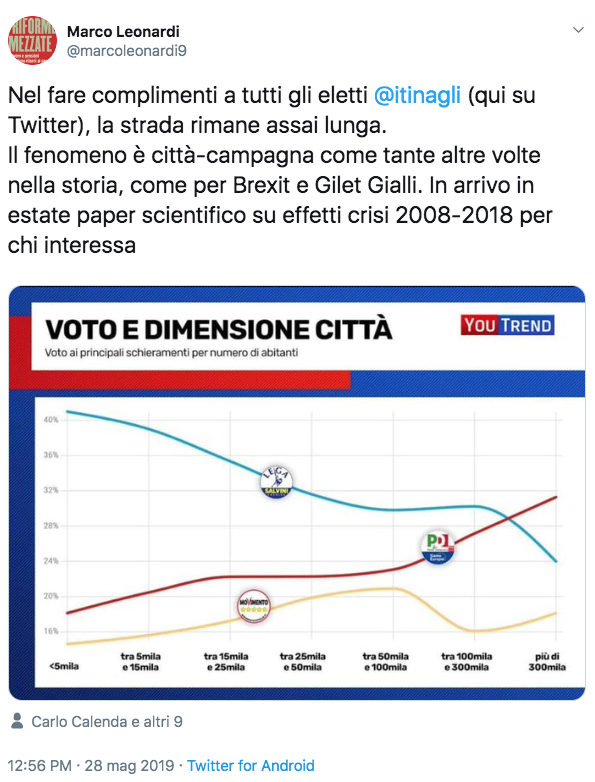 A cena un po' si può, ma non esagerate nelle analisi del voto sulle divisioni città/campagna o centro/periferie, vanno bene per chiacchiere da aperitivo, neanche da cena. Per passare a qualcosa di più proficua servono lavoro e competenza. Come promette di fare questo studio, in arrivo però in estate, con cui potremo avere una serie di chiavi interpretative per il fenomeno della scissione elettorale classica (città/campagna è una costante) ma declinata alla nostra condizione attuale.