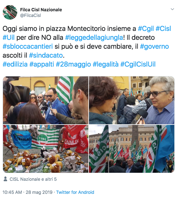 Allora, quando si imparano i concetti male, a orecchio, di straforo, alla fine le debolezze e le sciatterie emergono. E' giusto certamente tentare di accelerare il cammino amministrativo delle opere pubbliche da realizzare, ma, banalmente, bisogna saperlo fare. Altrimenti si trovano le soluzioni facili, da conversazione al bar, e si combinano grossi guai non con temi marginali ma, nel caso specifico, con la vita delle persone, con il loro lavoro, con le imprese. Lo hanno detto oggi i sindacati, davanti a Montecitorio, a proposito del cosiddetto sblocca-cantieri.