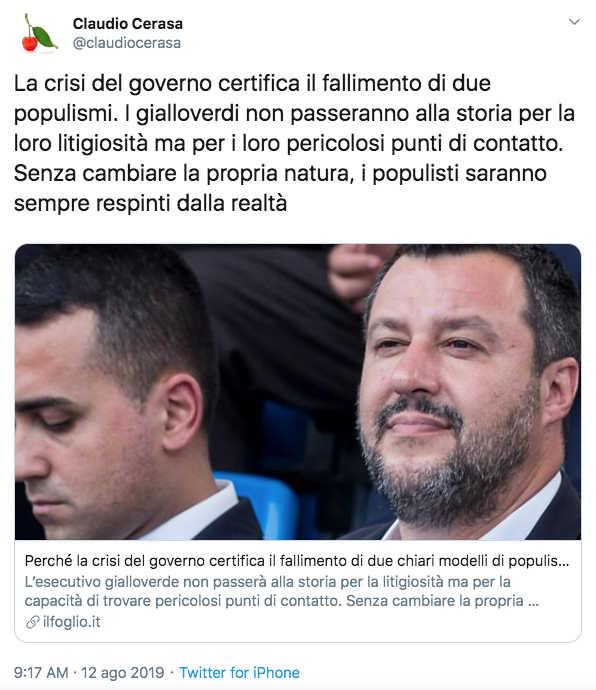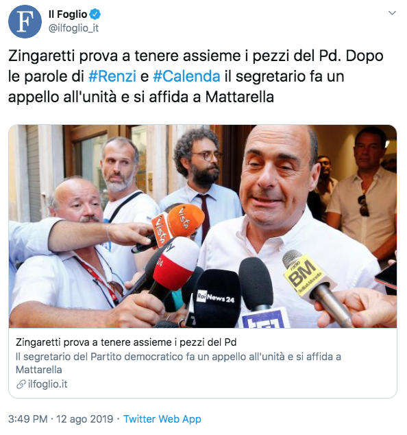 Chi è l'uomo del giorno, quello di cui parlerete nelle cene al mare, in montagna o meglio ancora in campagna? Ovviamente è il nuovo Churchill, detto davvero senza ironia, Nicola Zingaretti. L'uomo che dice no alla peace in our time con chi ha governato con Salvini e ne ha condiviso tutto e che dice sfidiamoli questi mostri gialloverdi, anche se ora sono divisi e spaccati. Perché sembrano quei mostri appunto da fantascienza che si dividono e poi si ricompongono. L'idra populista va affrontata tutta insieme, senza scherzare e senza farsi tentare.