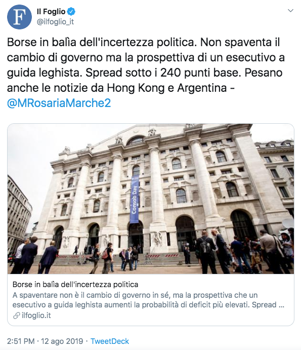 Comunque qui si riconosce a Salvini di averlo criticato ingiustamente nella cena di venerdì dicendogli che si era inventato il governo Grillo-Renzi. Cavolo, aveva ragione lui, e faceva anche bene, una volta tanto, ad approfittarne per comiziare e fare propaganda. Il governo super accrocco gli ha dato la possibilità, questa volta legittimamente, di sviare l'attenzione da sé e dalle proprie debolezze. Chi non si fa distrarre però sono gli investitori internazionali.