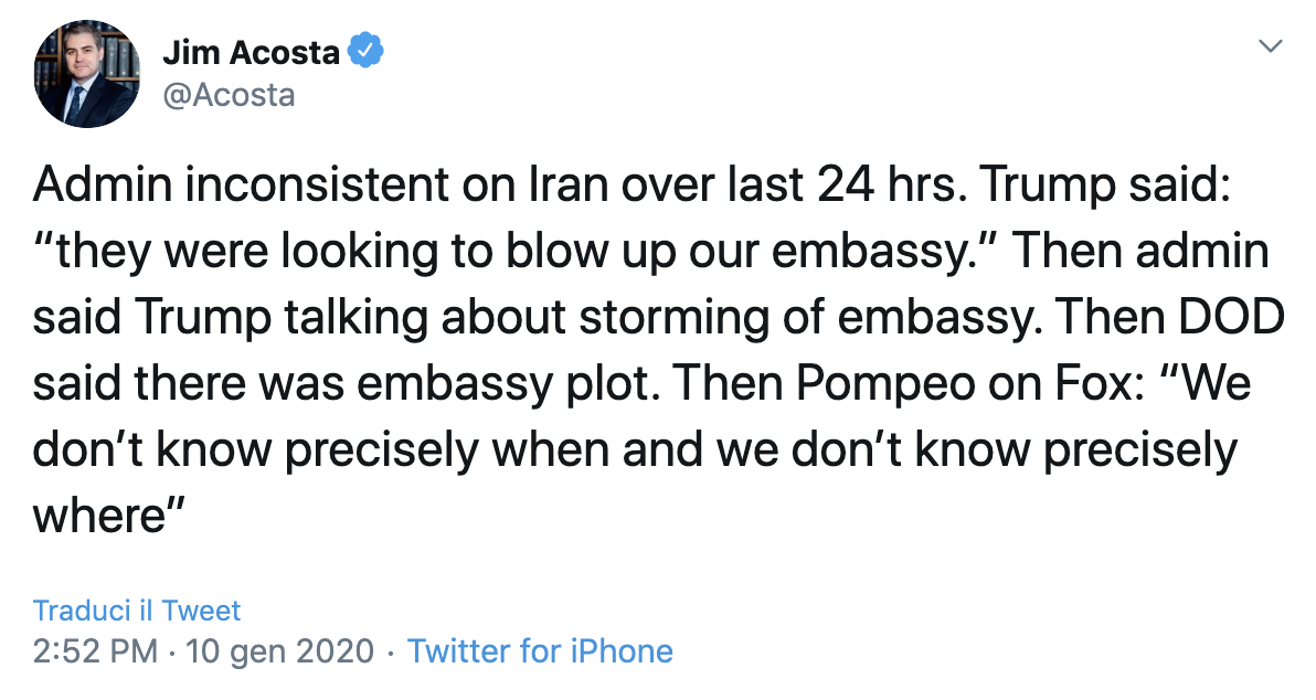 Intanto le varie parti dell'amministrazione USA ne hanno dette un po' tante e diverse sul piano iraniano contro l'ambasciata.