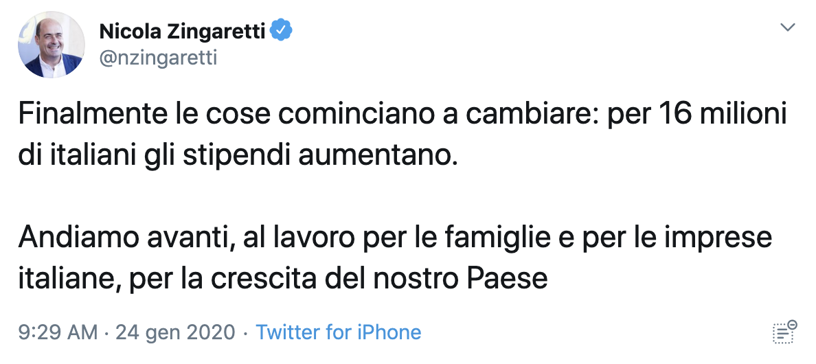 Però le campagne elettorali si fanno con messaggi semplici e non bisogna vergognarsene, ovviamente quando si sta dicendo qualcosa di vero. Poi tutto si potrebbe far meglio, come segnalano le critiche all'estensione del bonus che avete trovato anche sul Foglio. Certamente, a governo in piedi, servirà l'avvio di una riflessione comune per ridisegnare le tasse sul reddito ormai impazzite tra eccezioni, sconti, bonus, penalizzazioni indirette. Ma andare in campagna elettorale parlando di avvio di un tavolo è una cosa, indicare un decreto approvato è un'altra.