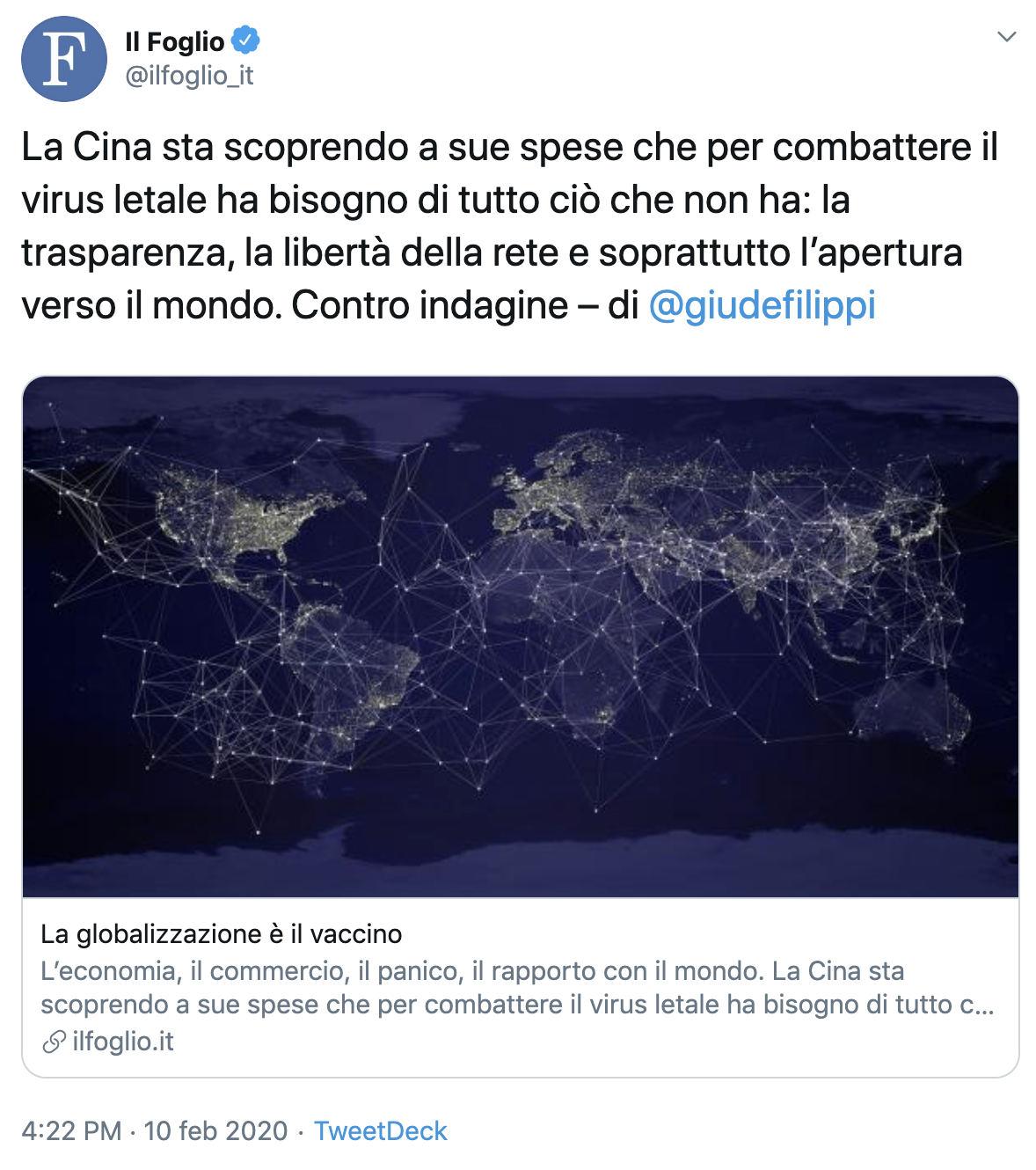 Oggi un po' di analisi e dati sul Foglio sulla questione del nuovo coronavirus e delle conseguenze che la sua diffusione sta avendo su economia, rapporti tra stati, commercio mondiale. La globalizzazione ha creato, in parte, il problema, ma fornisce anche gli strumenti per affrontarlo e, nello stesso tempo, diffonde, con fatica ovviamente, le regole del mercato aperto e della trasparenza. Leggete il Foglio e seguite, anche alla luce delle analisi lì proposte, gli sviluppi di giornata, dai quali emergono ulteriori preoccupazioni sull'intensità dell'epidemia e la pericolosità del virus.