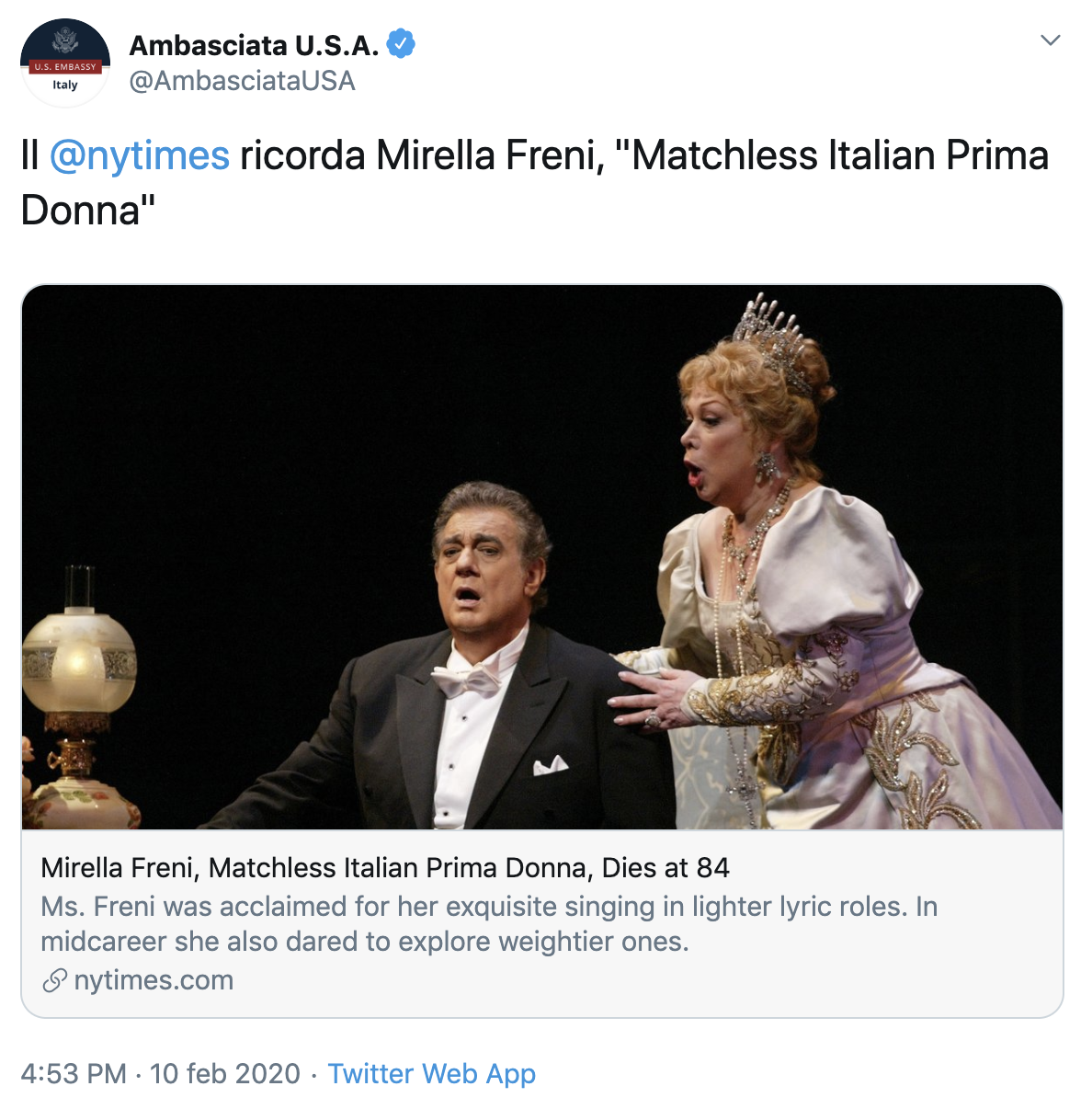 Facciamo i provinciali e ricordiamo Mirella Freni anche attraverso le parole del New York Times, ma se volete cose veramente di valore andate su sito o pagina Facebook de La Barcaccia.
