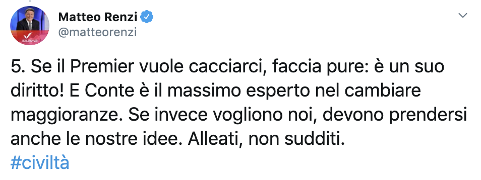 Nel frattempo ci stavamo scordando la crisi imminente, ah no, meno imminente, si direbbe anzi esclusa. Con la frenata renziana che viene presentata con espressioni e parole da schermaglia tra fidanzatini, pure un po' petulanti: se vuoi me devi prendere anche le mie idee, e cose del genere. Che poi nel caso specifico, riandate un po' più su, e con il riferimento ai cantieri (seppure narcotizzato con la ridondanza del cantiere per l'Italia) ma un po' delle loro idee era stato raccolto. Che poi si vedrà pure sulla prescrizione come far uscir fuori soluzioni senza stare a farla troppo complicata.