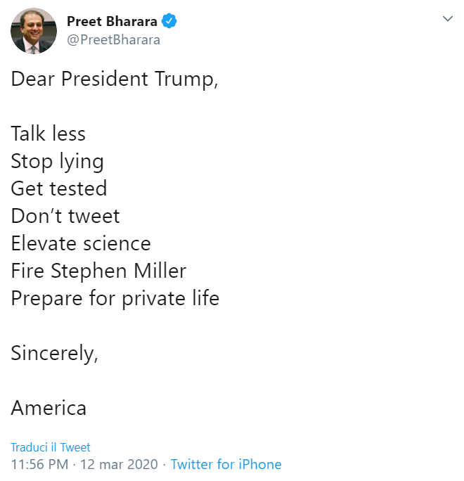 Virus presidenziale come mai nella storia, questo covid-19, ha tenuto il mondo in attesa per le voci sulla positività al test del presidente brasiliano Jair Bolsonaro, dal quale, si immaginava, sarebbe potuto passare, attraverso robuste e sovraniste strette di mano, alla Casa Bianca e proprio nelle cellule di Donald Trump, immortalato pochi giorni fa tra il presidente brasiliano e il suo addetto alla comunicazione, quest'ultimo certamente positivo al virus. Ma nel nostro pomeriggio si è saputo che invece Bolsonare aveva test negativo. Sì, va benem ma il tampone per trumpone? lo chiede, tra gli altri, l'ex procuratore generale Preet Bharara (un iper attivista della denuncia, per la verità).