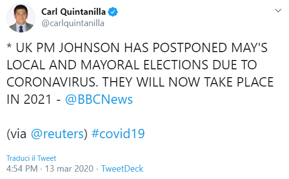 Perfino Boris Johnson rinvia le elezioni locali e il rinnovo dei sindaci.