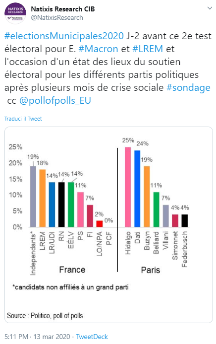 In Francia invece si vota per le municipali, mentre il paese si chiude per tante altre ordinanze. Confusione totale, mentre girano pure i sondaggi.