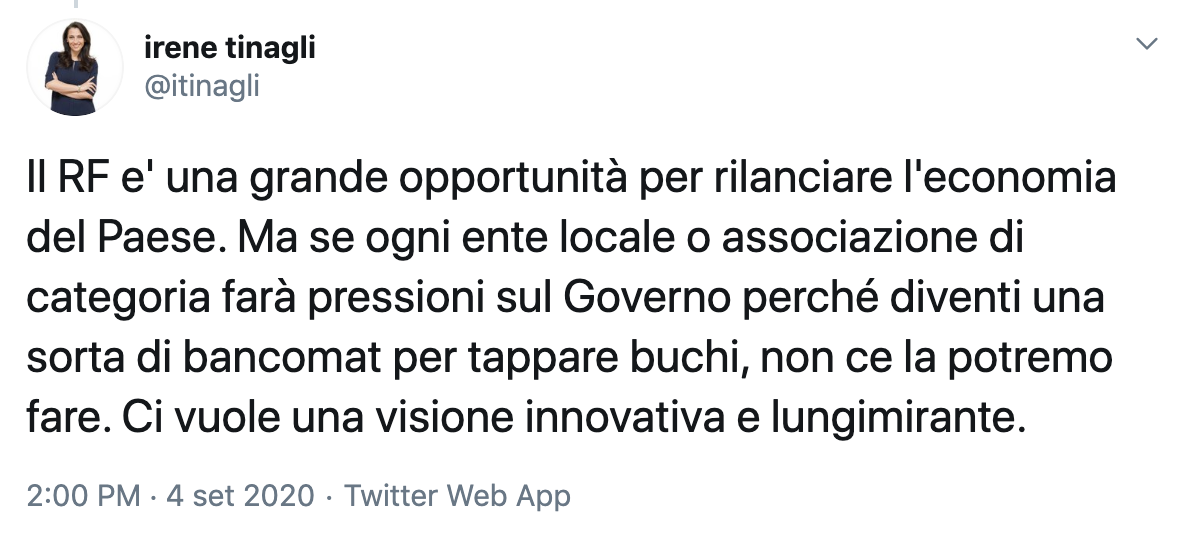 Irene Tinagli chiede di darsi tutta una calmata nella indicazione di progetti favolosi per usare i soldi del fondo per la ricostruzione.