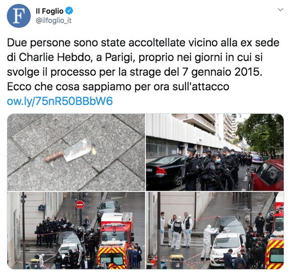 Attacco con una mannaia contro la sede di un’agenzia di stampa di fronte alla vecchia sede di Charlie Hebdo. Due persone sono state ferite e ora sono fuori pericolo. Un attentatore è stato catturato. E’ un diciottenne pakistano, con piccoli precedenti ma non ritenuto un elemento del radicalismo islamico. Un altro uomo, di 33 anni, è stato invece trattenuto per interrogatori