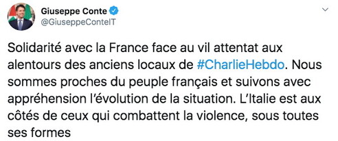 La solidarietà di Giuseppe Conte alla Francia a nome di tutti gli italiani