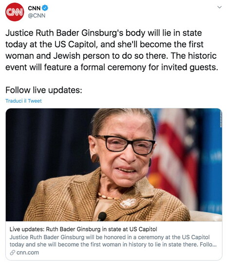 Ruth Bader Ginsburg avrà l’onore della sepoltura civile più importante degli USA e sarà la prima donna di religione ebraica