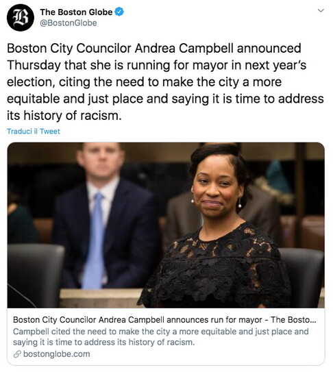 e auguri a Andrea Campbell che vuole diventare sindaca di Boston anche per riequilibrare la rappresentanza a favore dei neri