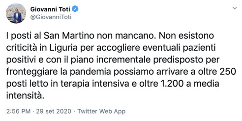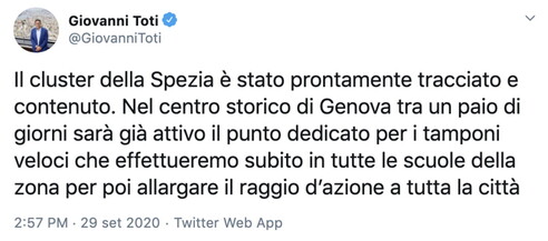 Il presidente della Liguria deve intervenire pubblicamente per dire a tutti di darsi una calmata sulla situazione sanitaria e che il sistema regionale non è in affanno. Ovviamente la vicenda dei calciatori del Genoa un po’ ha contribuito a creare questo eccesso dannoso di allarme. Ma la vera situazione da tenere sotto controllo era a La Spezia, come viene spiegato