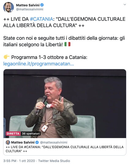 Ne parliamo a questo punto della cena perché Matteo Salvini, tra una cosa e l’altra, ha ribadito il suo endorsement per Trump. Detto questo date un occhio qui al link con il titolo un po’ marzulliano per la tre giorni catanese politico-giudiziaria organizzata dal leader della Lega per Salvini premier. Ed è anche un titolo un po’ pericoloso, dal punto di vista della bestia mediatica, per l’eccessivo interesse verso la parola “cultura”, alla quale di solito ci si attacca quando si è in crisi di idee. E per la destra salviniana non sembra che a Catania siano in arrivo le auspicate idee nuove, addirittura le svolte europeiste. Da una visione iniziale delle presenze e degli interventi programmati e dai toni con cui si è cominciato sembra proprio che invece lì si intenda celebrare una specie di rifondazione salvinista. Non andrà a finire bene con le componenti leghiste più inclini al dialogo italiano ed europeo e al riconoscimento delle ragioni della coalizione di centro-destra