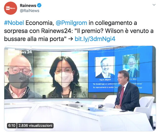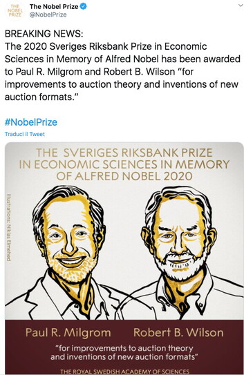 con un fantastico collegamento in cui uno dei vincitori, Milgrom, prende di sorpresa il conduttore di RaiNews (che continua a chiamarlo con il nome dell’altro vincitore, salvo poi parzialmente riprendersi) presentandosi tranquillamente in uno studiolo, grazie ai contatti con Silvia Console Battilana, che è capo azienda della auctionomics, società impegnata proprio nel settore delle aste e quindi vicina agli studi dei due professori vincitori di Nobel