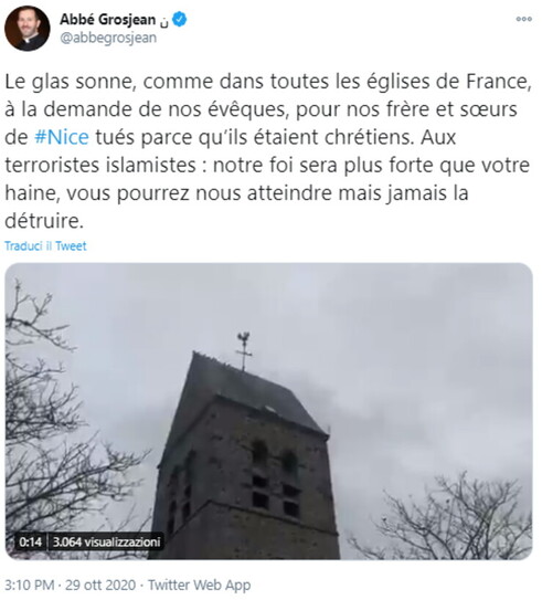 Le campane che oggi hanno suonato a morto in tutta la Francia nell’ora, le 15, in cui morì Gesù sulla croce. C’è una risonanza in quelle campane che raggiunge anche la Francia in cui le chiese si sono via via indebolite, svuotate