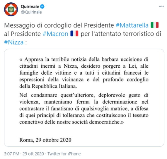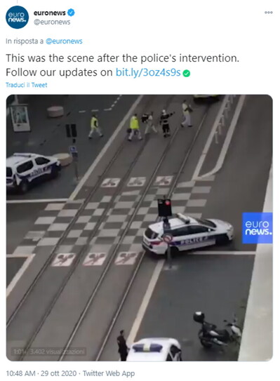 La violenza contro la Francia, contro i cristiani, contro la laicità dello stato, che colpisce con azioni improvvise cittadini inermi e impossibili da difendere. Gli attacchi si sono susseguiti in questi anni. La strage nella redazione di Charlie Hebdo è stata un momento di passaggio, in cui la violenza islamica e la segregazione sociale che fa dell’Islam politico uno strumento per affermarsi, ha trovato nella libertà di espressione un nemico più identificabile e tipicamente europeo e ancora più tipicamente francese. Attaccare anche i frequentatori di una chiesa, di una cattedrale, in una tranquilla mattina, come è successo questa mattina a Nizza, significa mettere tra i nemici tutta la società francese, mischiando gli atei e i dissacratori al mondo dello stato e della formazione e ai cattolici e a tutti i cristiani. Una donna muore chiedendo che si dica ai suoi figli il bene che vuole loro, e muoiono per i colpi di coltello altre due persone. Intanto si sente di altri casi di persone armate di coltello fermate a Lione e ad Avignone. L’assassino ha firmato con il solito inneggiamento ad Allah