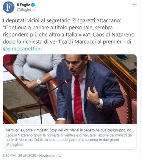 la verifica da verificare perché la chiede il capogruppo del Pd, Andrea Marcucci, ma non la chiede il suo partito, dal quale, anzi, sembra arrivare un certo nervosismo verso il capogruppo, già fervente renziano e ora, apparentemente, sulla stessa linea di Iv. Comunque corrono voci impetuose su rimpasti, cambi di guida del governo, cambi di maggioranza, un po’ di tutto. La giornata politica, a dispetto della necessità di sopire per un po’ i contrasti tra partiti per poter far fronte alla crescita impetuosa della seconda ondata, diventa una specie di vigilia di crisi, senza sapere però non tanto quale esito dare alla crisi ma proprio senza sapere esattamente di che crisi si stia parlando. Sembra tutto un po’, come dire, mimato più che veramente vissuto e anche le posizioni politiche contrapposte suonano tutte un po’ vuote, prive di aggancio con la realtà e con la rappresentanza sociale e del paese. Anche le aspettative sul governo alternativo a questo, successivo, futuro, sono cariche di enfasi sui nomi (splendidi per la verità) ma più caute sui programmi, facendo immaginare che si chiamerebbero a raccolta i super nomi della repubblica per fare altri lockdown e altri dpcm (perché come hanno mostrato gli altri paesi europei c’è poco da fare in alternativa ancora per un po’ almeno)