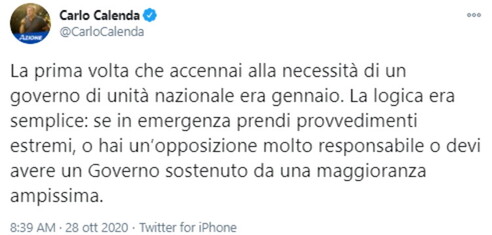 Ma Carlo Calenda intanto (forse sentendo l’eco delle voci su nuova maggioranze e nuovi governi e contribuendo a diffonderne a sua volta) si è già scocciato della corsa per Roma?