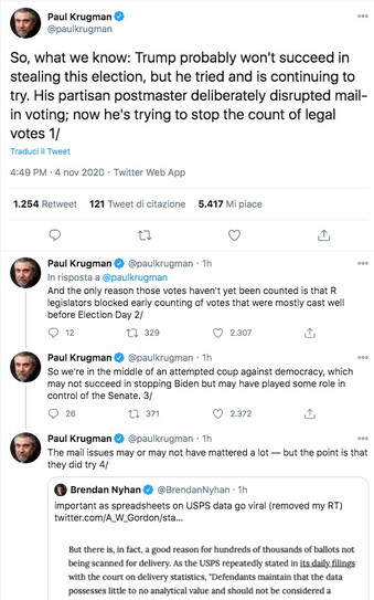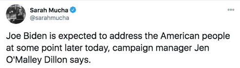 nella serata italiana o forse già nella notte potrebbe arrivare la rivendicazione della vittoria da parte di Biden, lo dice l’informata cronista Cnn e vincitrice di Pulitzer Sarah Mucha