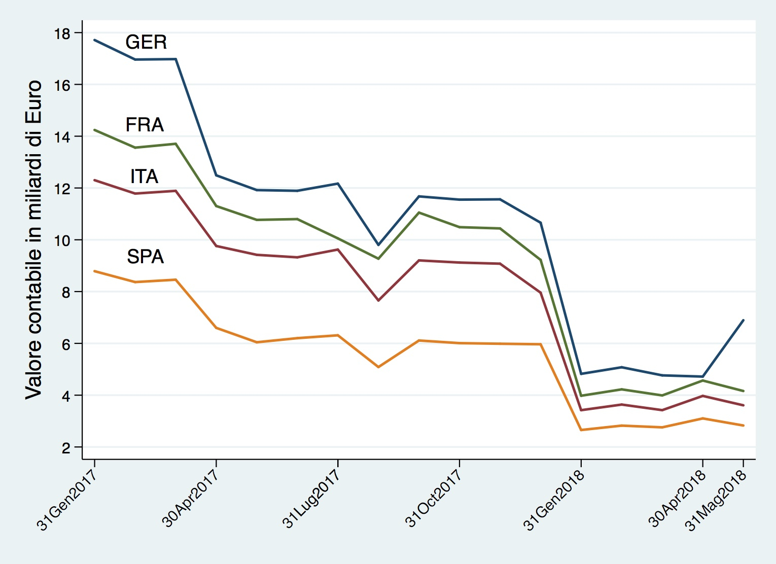 L’operato della Bce è stato violentemente attaccato da esponenti (più o meno periferici) della nuova maggioranza di governo, con l’accusa di aver discrezionalmente diminuito l’acquisto di titoli italiani al fine di manipolare al rialzo lo spread, per presunti fini politici. La Figura 1 mostra che, effettivamente, nel Maggio 2018, gli acquisti netti di titoli italiani da parte della Bce sono diminuiti rispetto ad Aprile (dopo essere saliti rispetto a Marzo); e contemporaneamente sono saliti gli acquisti netti di titoli tedeschi. Questa asimmetria, di per sé, può aver contribuito ad un rialzo dello spread Btp-Bund. Si noti però che durante lo stesso mese di Maggio la Bce ha diminuito l’acquisto di titoli anche di altri paesi quali Francia e Spagna (e altri non riportati per chiarezza del grafico). Lo spread di ciascuno di questi paesi rispetto al Bund tedesco decennale è infatti parzialmente salito. In sintesi, e’ dunque semplicemente falso attribuire alla Bce la decisione di aver venduto titoli di Stato italiani in modo discrezionale e selettivo.