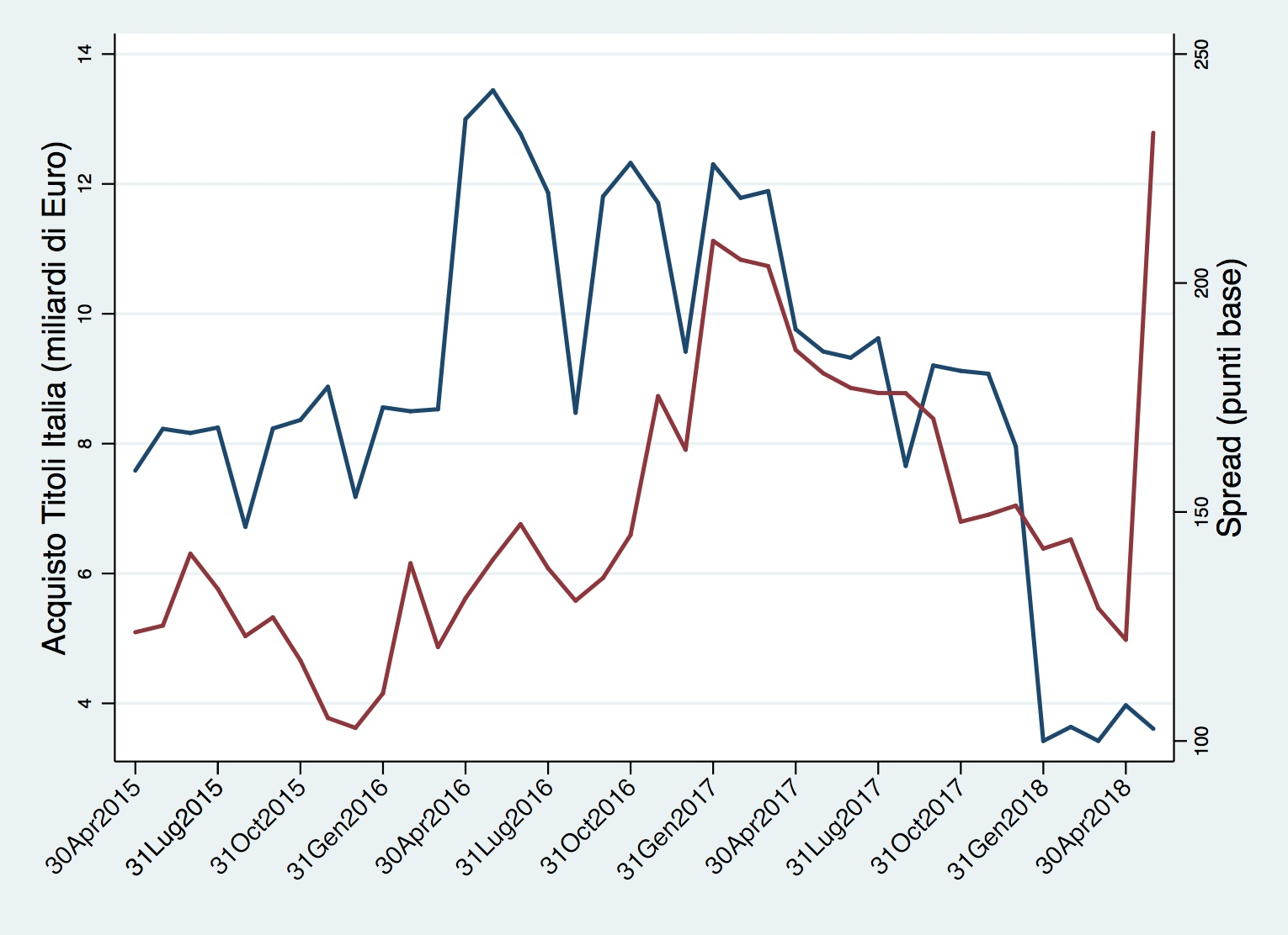 Lo spread Btp-Bund, a differenza degli spread Francia-Germania e Spagna-Germania, è in salita dall’inizio del mese di Maggio. Vale a dire dall’inizio delle trattative tra Lega e Movimento 5 Stelle per la stesura del cosiddetto contratto di governo. In un crescendo culminato con l’affaire Savona-Mattarella, le sciagurate rivelazioni sul piano B di uscita dall’euro e altri pericolosi balletti sulla plancia del Titanic. Più in generale, la correlazione tra spread Btp-Bund da un lato e acquisto di titoli italiani da parte della Bce dall’altro è molto debole, o addirittura positiva in tutto il periodo: lo spread spesso sale quando la Bce acquista più titoli, e non il contrario come argomenterebbe la teoria del complotto. Ad esempio, tra Gennaio 2016 e Aprile 2017 lo spread Btp-Bund sale da 100 a più di 200 punti base, proprio in una finestra temporale di massima ascesa degli acquisti di titoli italiani. Un osservatore più attento potrebbe (al massimo) argomentare per la causalità contraria, cioè che sia lo spread a determinare gli acquisti dellla Bce: quando lo spread sale, allora la Bce interviene aumentando gli acquisti, proprio per calmierarlo. Questa osservazione, diversamente dalla teoria del complotto, non sarebbe in contrasto con i dati della Figura 2. Ma sarebbe comunque erronea. Perché ignorerebbe il fatto che la Bce, come visto in Figura 1, non interviene con acquisti selettivi dei titoli di Paperopoli in risposta all’incremento dello spread dei titoli di Paperopoli rispetto alla Germania; bensì interviene in modo simultaneo aumentando, o diminuendo, l’acquisto di titoli di tutti i paesi dell’eurozona.