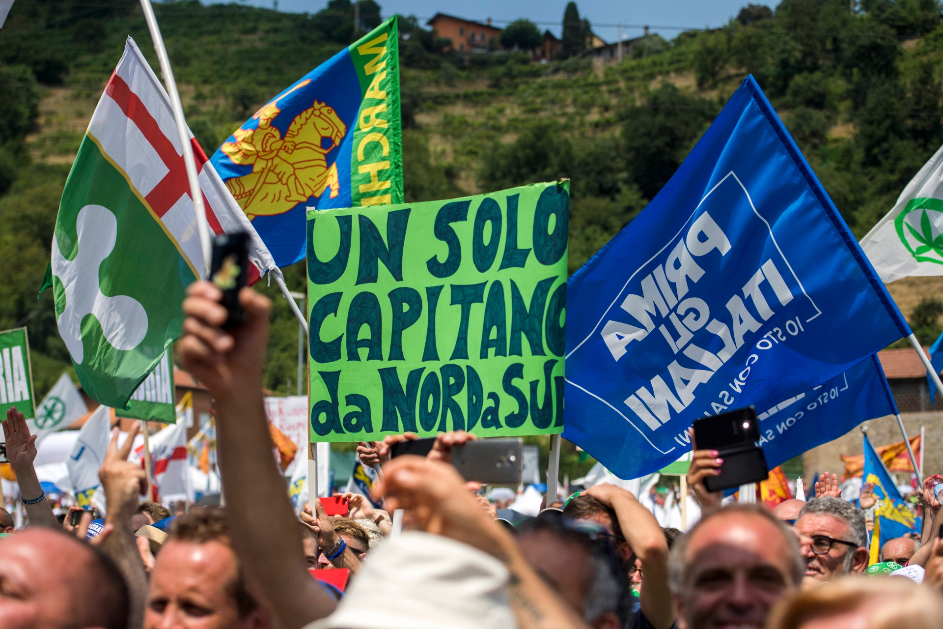 “Prima gli italiani” . uno degli slogan risuonati nel corso dell’ultimo raduno leghista a Pontida (LaPresse)