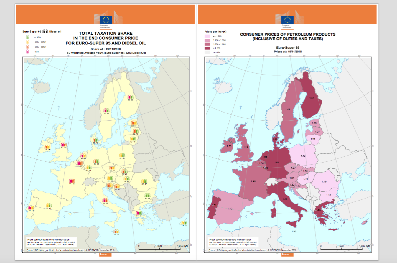 Come se non bastasse l'Italia è il paese che paga il prezzo più alto in Europa per fare il pieno di benzina. E questo nonostante, al contrario di quello che dice Salvini, le tasse non siano le più care. In percentuale rispetto al prezzo finale, accise e Iva pesano nel nostro paese per il 63 per cento, una percentuale molto alta ma inferiore a quella di Francia e Grecia, dove si arriva al 64 per cento, e dell'Olanda, pari al 67 per cento. Il pieno però costa di meno in tutti e tre i paesi, Francia compresa, dove i gilet gialli protestano per i prossimi rincari introdotti da Emmanuel Macron. I dati sono quelli dell'ultimo Oil Bullettin della Commissione europea e si basano su una rilevazione del 19 novembre. La mappa sotto mostra il confronto tra tutti i paesi europei per incidenza fiscale e prezzo finale.