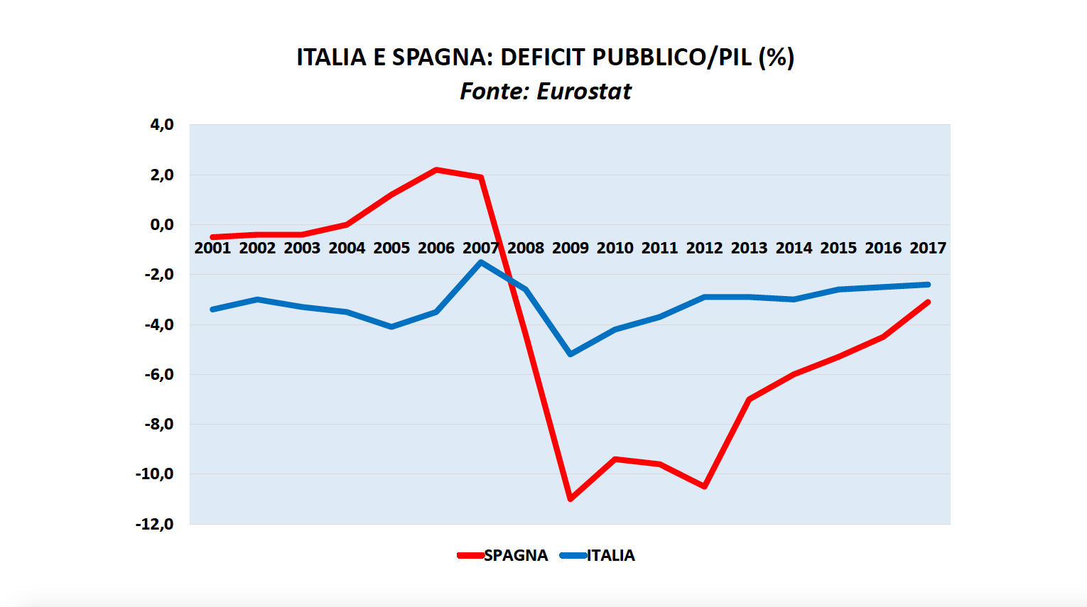 La differenza principale tra noi e la Spagna viene invece dal maggior contributo al pil che è derivato a Madrid dalla spesa delle amministrazioni pubbliche e dall’export. Infatti, la Spagna ha potuto godere nell’ultimo decennio di un più ampio margine di intervento statale, con i consumi finali governativi che nel 2017 erano addirittura del 9 per cento più alti rispetto al 2007 mentre l’Italia è ancora indietro del 2,6 per cento. D’altronde, mentre l’Italia già nel 2012 era uscita dalla procedura europea per deficit eccessivo, mantenendo da allora in poi il rapporto deficit/pil sempre uguale o costantemente calante e inferiore al 3 per cento, la Spagna ha inanellato dal 2008 a oggi una sequenza di sforamenti record del parametro simbolo di Maastricht, con punte massime al -11 per cento nel 2009 e a -10,5 per cento nel 2012, per poi mantenere un deficit/pil sostanzialmente doppio di quello italiano nel quadriennio 2013-2016 e scendere a -3,1 per cento soltanto nel 2017. Madrid ha potuto fare tutto ciò perché il suo debito pubblico a inizio della crisi nel 2007 era ancora al 35,6 per cento del pil mentre noi eravamo già al 99,8 per cento. Sicché, a colpi di deficit, il debito spagnolo è salito di ben 62,5 punti percentuali di Pil nel periodo 2008-2017 (praticamente una crescita doppia di quella nostra), portandosi al 98,1 per cento, livello alto ma che permette ancora oggi alla Spagna di non sembrare agli occhi dei mercati finanziari troppo “a rischio” come viene invece giudicata l’Italia.