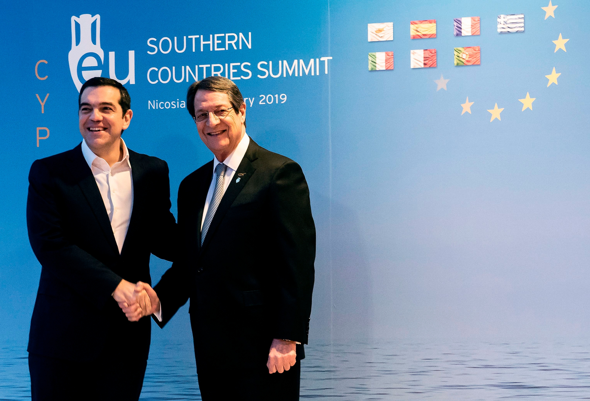 Il premier greco Alexis Tsipras stringe la mano al presidente cipriota Nicos Anastasiades nel summit dei paesi dell'Europa del Sud a Nicosia (Foto LaPresse)