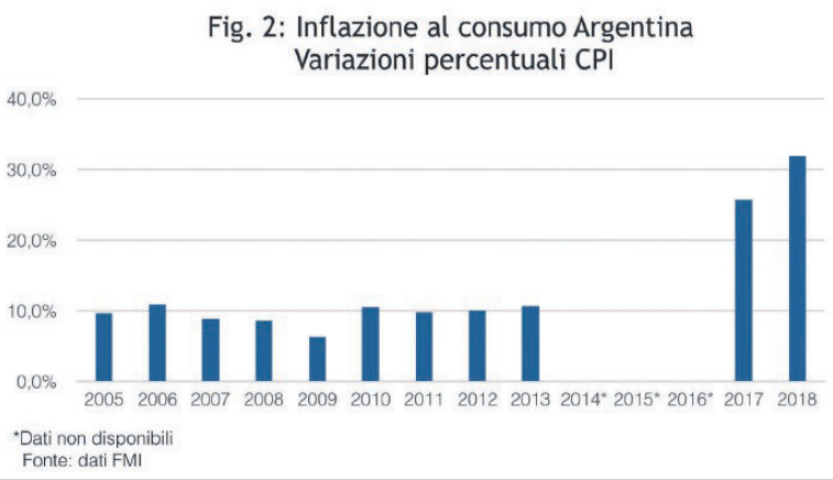 La svalutazione del cambio non è necessariamente un bene e può anzi essere un gravissimo problema economico e anche sociale. L’idea che la svalutazione del cambio sia una sorta di albero della cuccagna è stata propagandata in questi anni da diverse parti, ma non trova alcun riscontro nella riflessione degli economisti. Una svalutazione eccessiva genera inflazione e impoverisce i detentori di moneta e tutta quella ampia parte della popolazione che vive di redditi fissi: lavoratori dipendenti e pensionati. Né il problema può essere risolto con l’indicizzazione di questi redditi, perché ciò non farebbe altro che produrre un avvitamento verso l’alto di prezzi e salari. In Argentina, l’inflazione al consumo secondo gli ultimi dati relativi al mese di luglio è al 54,4 per cento ed è destinata ad aumentare per via della recente svalutazione del cambio (si veda Fig. 2). Si noti che gli attuali dati sull’inflazione non sono confrontabili con quelli degli ultimi anni dei governi Kirchner per il fatto che le statistiche prodotte da quel governo erano manipolate e le fonti internazionali (Fmi, Ocse ecc.) decisero di sospenderne la pubblicazione.