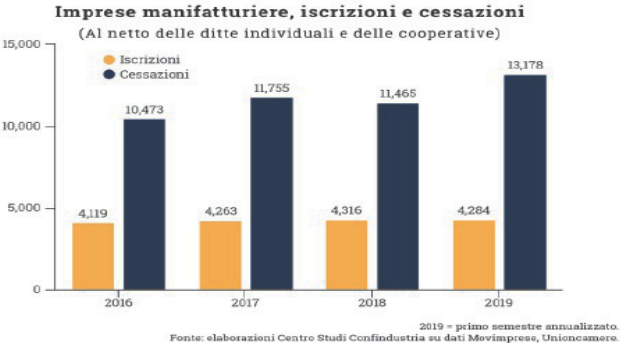Il numero di imprese attive nella manifattura in Italia ha subito negli anni successivi alla crisi un costante ridimensionamento. Secondo i dati forniti dagli Archivi camerali dal 2008 al 2018 la contrazione è stata di oltre 100 mila unità. Tra il 2016 e il 2018 la flessione cumulata è stata ancora di quasi 21 mila imprese. La stima per il 2019 (primo semestre annualizzato) indica una ulteriore accentuazione di questa tendenza a causa sia di un aumento delle uscite che di una flessione delle entrate. Questo dato è preoccupante perché si inscrive in un quadro di nuovo deterioramento delle prospettive di crescita, come mostrato dall’andamento della produzione industriale manifatturiera, le cui variazioni tendenziali risultano negative dalla metà del 2018. A cura del Centro studi di Confindustria